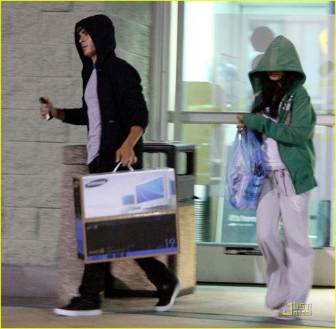 De volta à Califórnia depois de férias calientes no Caribe, os pombinhos Zac Efron e Vanessa Hudgens foram às compras nesta segunda-feira, 21, em Burbank. Apesar de terem tentado fugir dos paparazzi usando casacos com capuz, os atores foram clicados na loja Best Buy.